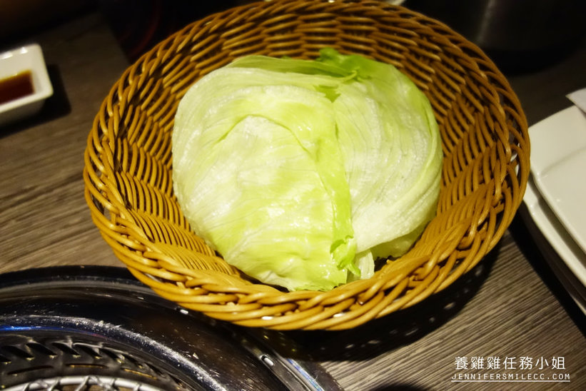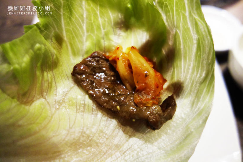 隨醬料盤上桌的是很好吃的韓國泡菜,服務員介紹之後可以包著生菜和肉吃,真的很讚。