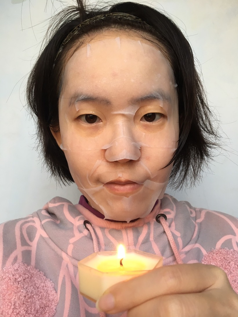 敷上中間層天絲面膜,並將最上層藍色紙膜取下