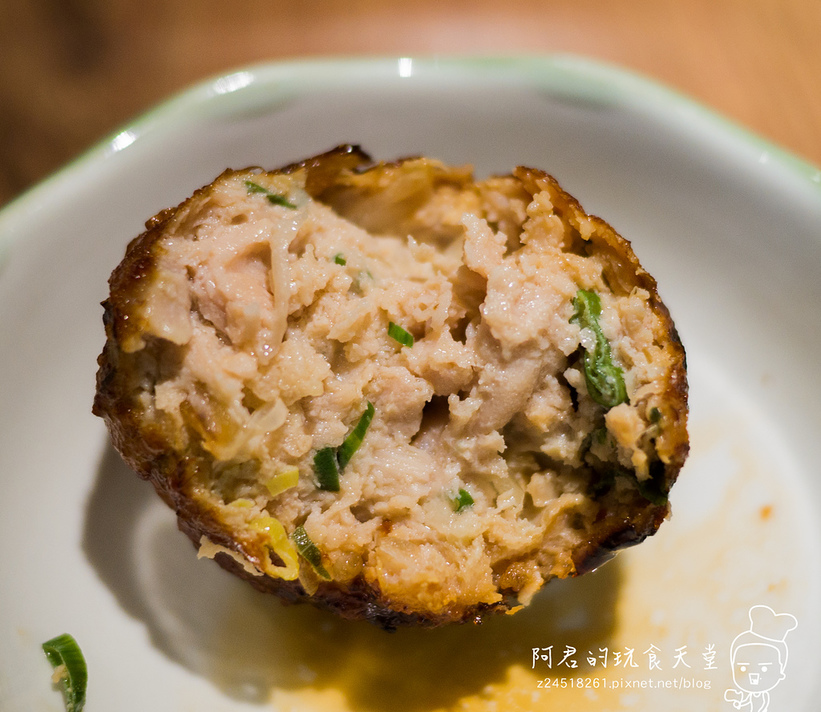▼使用雞腿肉跟雞軟骨手打而成,份量十足,外表看似很硬,沒想到裡面卻充滿了肉汁。