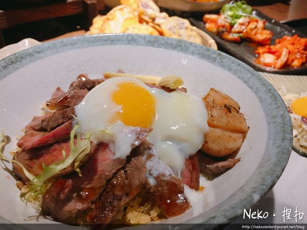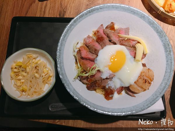 上餐後視覺效果也是十足!烤的粉嫩的牛小排搭配上一顆炙燒大干貝上面再來一顆半熟溫泉蛋~~~忍不住馬上來開丼啦!