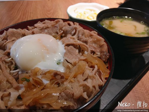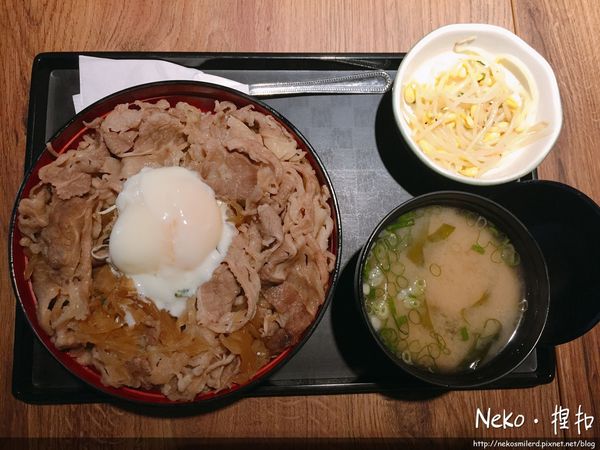 牛肉丼上面鋪滿了洋蔥牛肉片鹹甜入味,一定要配著半熟蛋黃和醬汁拌飯阿!看起來很大碗但是其實碗比較淺,所以不用擔心飯量會太多,旁邊的黃豆芽我們則是認為有點太鹹
