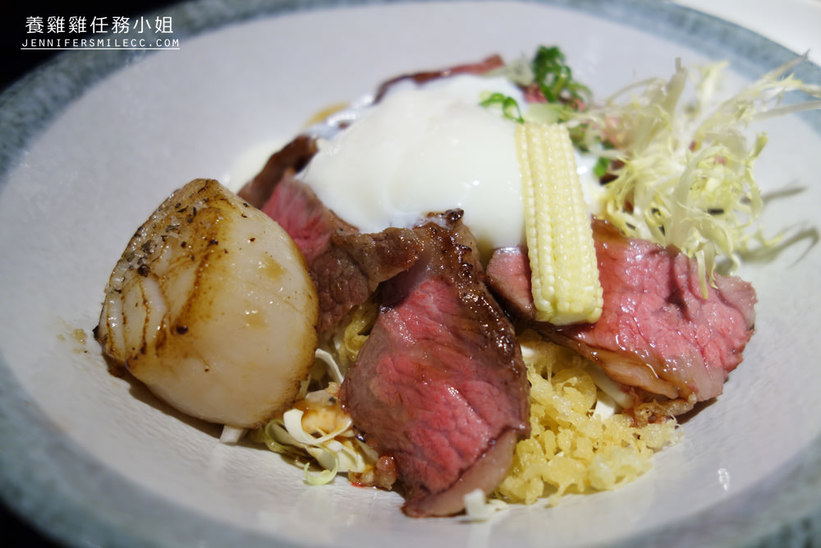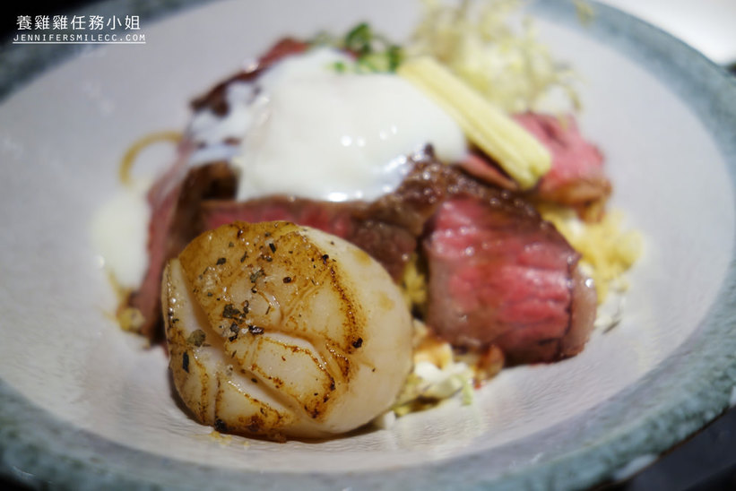 還有一顆日本食用級的新鮮炙燒干貝,再打上一顆半熟的溫泉蛋~