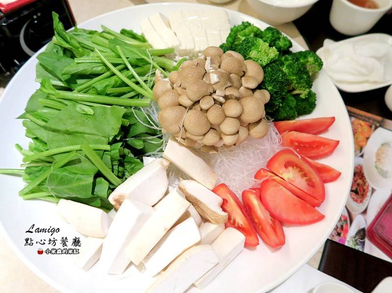 蔬菜盤非常的豐盛,有鴻喜菇、番茄、豆腐、香菇、花椰菜、杏鮑菇、青菜、冬粉