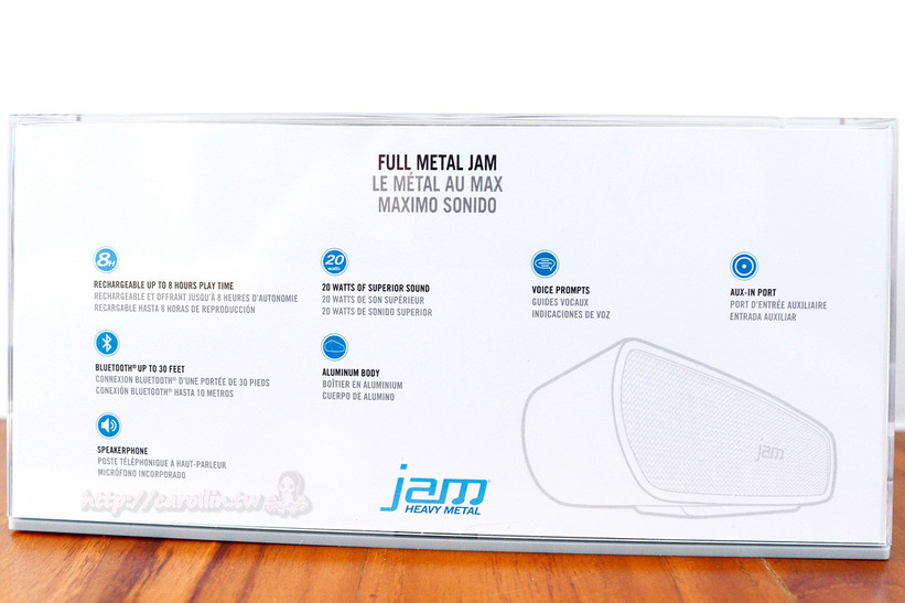 「Jam Heavy Metal 無線藍牙喇叭」吸引人的幾點特色都在盒子下方列了出來。
