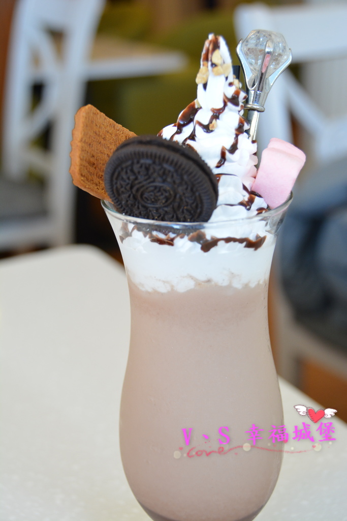 甜蜜蜜的香草那堤,上頭有著鮮奶油再淋上巧克力醬,一旁放著OREO餅乾,