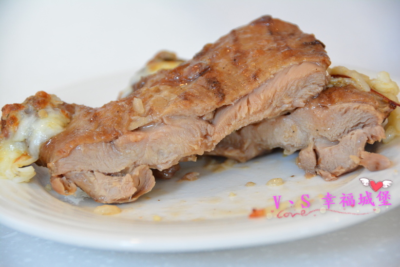 將 蒜香嫩烤雞腿 取出,先挖飯吃,入口先感受到德式香腸的口感,還有吸飽白醬的米飯。
