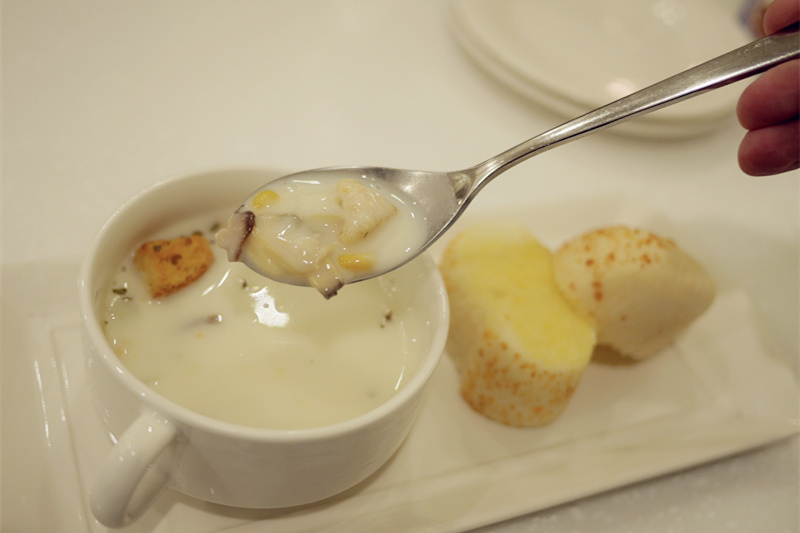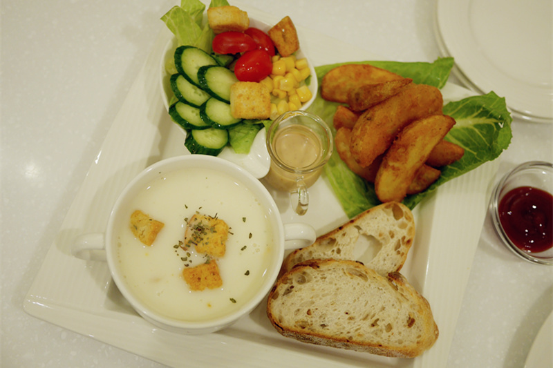 套餐有附玉米濃湯、麵包、脆薯跟水果沙拉。它們的玉米濃湯料很豐富,有馬鈴薯、香菇、麵包屑跟蛤蠣,濃度還OK,還不錯喝。附餐的麵包很鬆軟,薯條也很大塊,都還蠻好吃的。