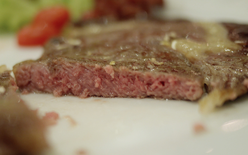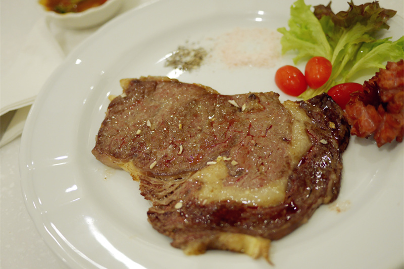 最令人期待的肋眼牛排來囉~真的超大一片,我選擇了老闆非常建議的五分熟,表層很熟,裡面的肉比較生,但不會有血水唷!它的肉質還蠻鮮嫩,而且油花味好香,旁邊還有附上玫瑰鹽、黑胡椒醬及紅醬可以搭配沾取,但我覺得光是直接吃就很好吃了。