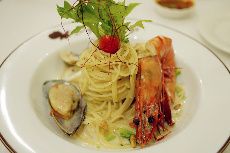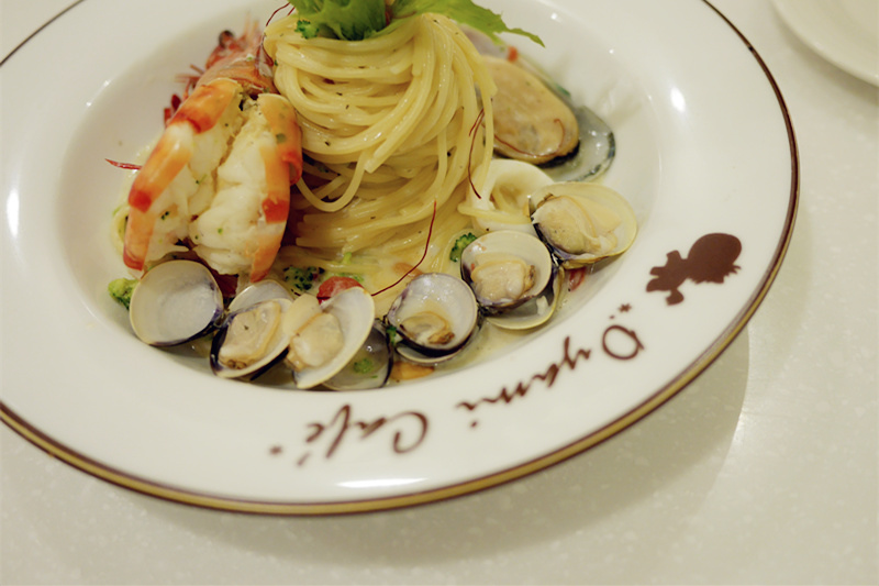 不過它的料好豐盛,有大隻的蝦子、九孔跟蛤蠣,蝦肉的肉質略嫌老了一點,義大利麵的麵條煮得太軟,不夠彈牙,所以這道我比較沒興趣。