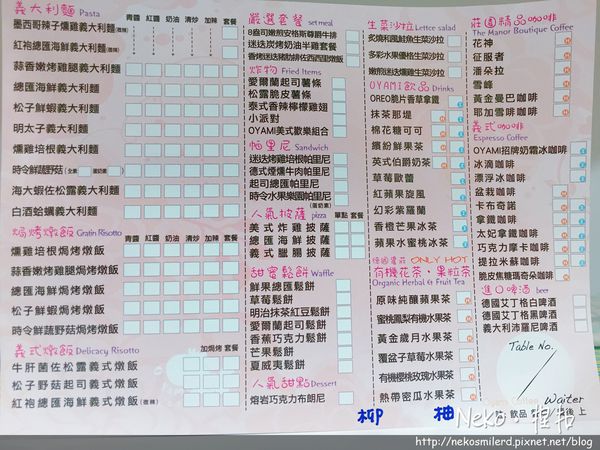 Oyami cafe 的菜色非常多樣化,舉凡燉飯、焗烤飯、義大利麵、帕里尼、披薩、甜點、沙拉、咖啡、飲料都有~