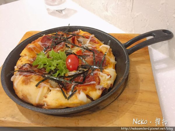 灑上海苔絲和美乃滋真特別,餅皮是比較厚的,但是酥脆有口感還滿好吃的迷你的一人份小披薩~