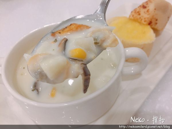 濃湯的用料很實在~吃到許多蛤蠣、香菇、馬鈴薯,蛤蠣和香菇都為湯頭帶來鮮甜的滋味,麵包上面有抹奶酥,單吃或拿來沾著濃湯吃都很適合