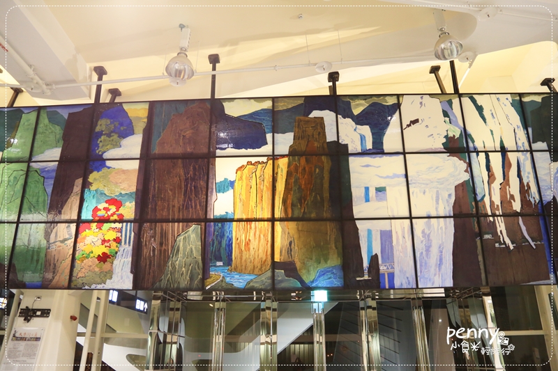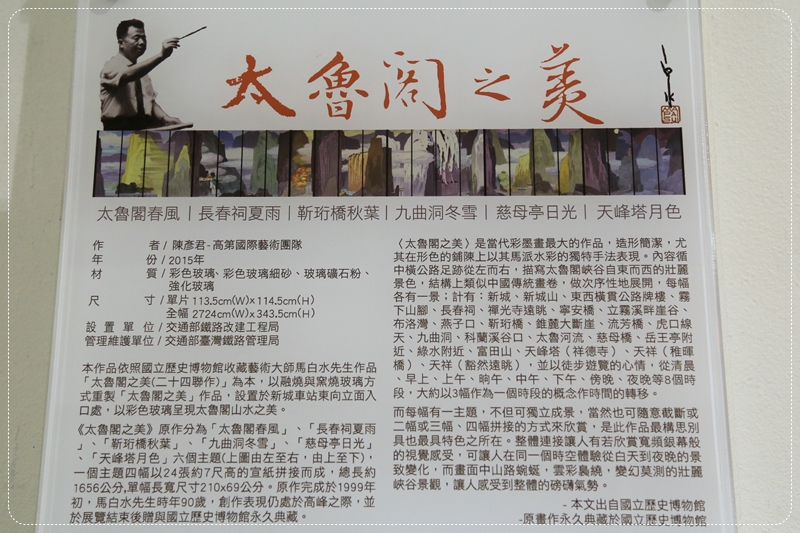 而大廳的一側,是一排由花蓮藝術家陳彥君運用窯燒玻璃創新技法,將已故水墨畫家—馬白水教授的「太魯閣之美」以另一種方式重生,畫作中的蜿蜒山路和壯麗峽谷的景觀,以讓人感受到太魯閣磅礡的氣勢。