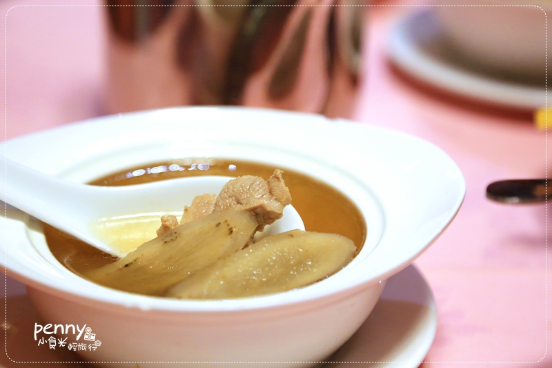 蒜蓉蝦底下竟然還有冬粉,置於蒜蓉蝦下方的冬粉,因為吸收了了蒜蓉鮮蝦的醬汁而呈現甘甜的美味。 牛蒡排骨湯