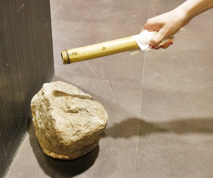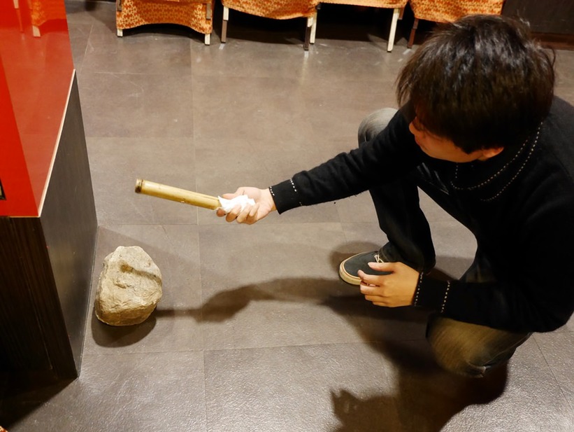 旁邊的地上的石頭,就是專門用來敲竹筒的