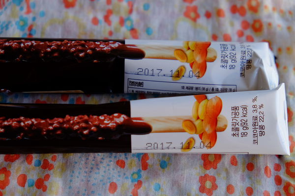 拿出啾可,巧克力和花生巧克力。乍似外館很雷同。20公分長的巨大巧克力,有多長呢??