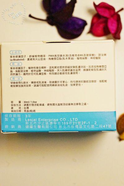 成分為草本修護因子、舒緩植物精萃、PMA高效鎖水液(含維他命B5及玻尿酸)、複合型神經醯胺、維他命E、瑪乳拉果油。