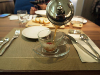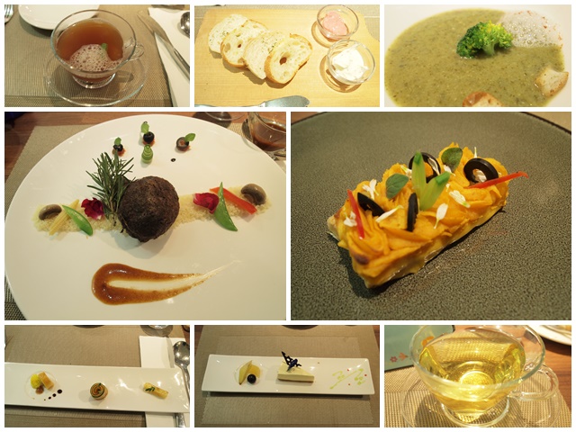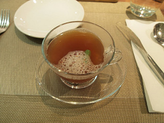 The first course was Consommé Soup. This clear soup is an important type of French soups and stews. I heard that the chef mixed seven or eight different vegetables in this soup. The key to making a high quality consommé is simmering; the act of simmering, combined with frequent stirring, brings impurities to the surface of the liquid. Unconsciously I took a deep breath and yelled, “おいしいです" “Hào chī".