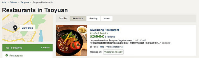 Guess what? I very like to surfer TripAdvisor to find the best restaurants, hotels and things to do before I travel abroad. I also recommand you to use the web to find the best restaurants, hotels and things to do in Taoyuan. Recently I had a chance discovery about TripAdvisor. There is “Vegetarian Friendly” option to filter restaurants. And you will find the best Taoyuan fine dining vegetarian restaurant is Taoyuan Avignon Vegetarian Restaurant.