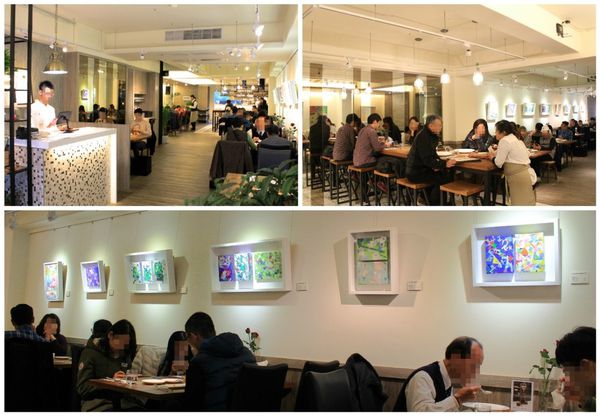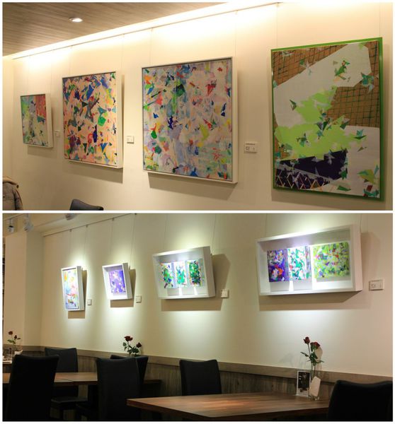 sasa前往用餐的時候,正在進行林怡君《交換總和》個展 ,我沒什麼藝術細胞,無法對藝術品進行太深層的評價,但現正展出的林怡君畫作是以剪紙剩餘的紙屑為發想,組合成沒有固定線理的多重空間,用色粉嫩繽紛,很舒服活潑的作品。