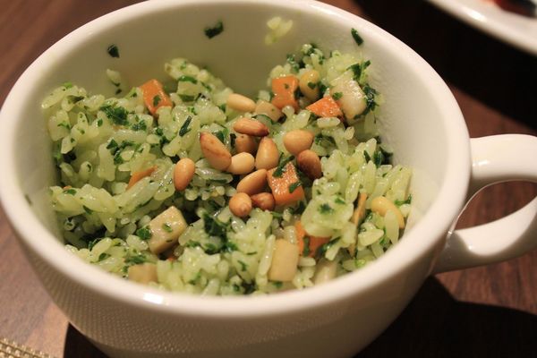 Mixes rice with basils, pine nuts and chickpeas. I reckon it's not as oily as Chinese fried rice. It's fresh and flavorful.