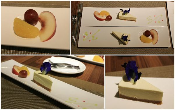 甜點是生起司蛋糕以及水果。水果用心的搭配三款,有桃子、葡萄、柳丁,不只多汁而甜,應該連配色都考慮進去了,就說了這一餐不只是味覺也是視覺的享受。