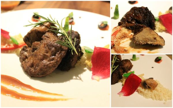 一旁佐有蘑菇、玉米筍、甜豆等清燙蔬菜,以及北非小米。北非小米近年在台灣好像也挺流行的,營養價值甚至比白米高,熱量又低。這裡的北非小米沒有特別調味,可以拌一些上菇排醬一起吃,滿特別有趣的口感。