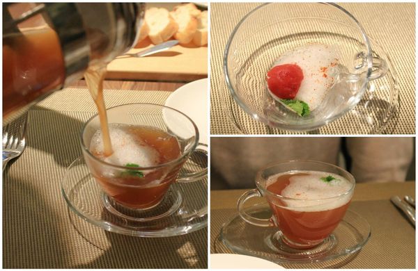 一樣先上來一個只有一個番茄跟白色泡沫的空蕩蕩杯子,剛才說了會有桌邊加湯秀了,就來提提sasa特地向服務生問來的白色泡泡的身世。