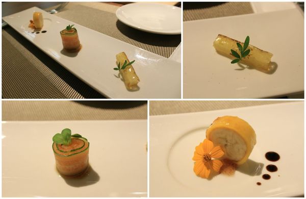 餐前開胃菜是三樣精緻的小點,分別是桂花蘋果捲、黃瓜蒟蒻捲、焦糖香蕉捲。