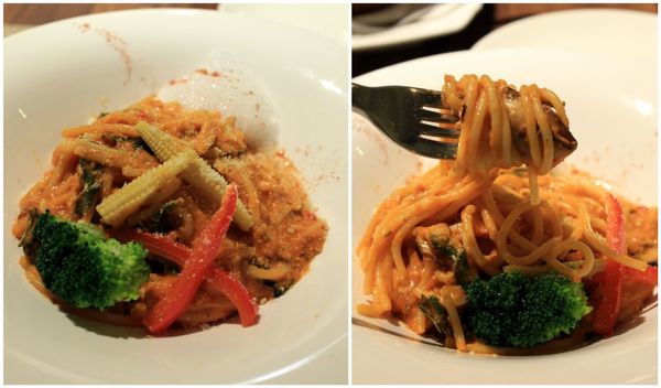 醬汁很濃稠,每條麵條都可以沾裹到,每一口的味道都很平均,加上鋪於其上的甜椒、青花菜、玉米筍,美味無負擔。