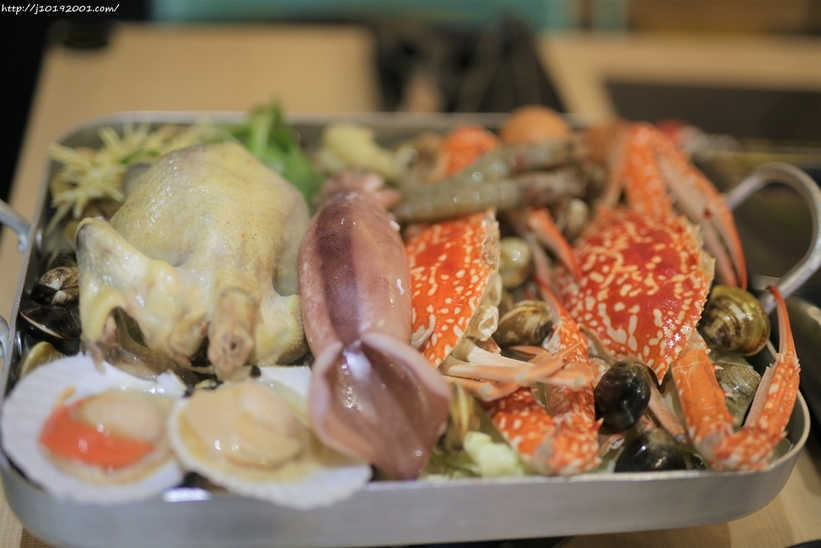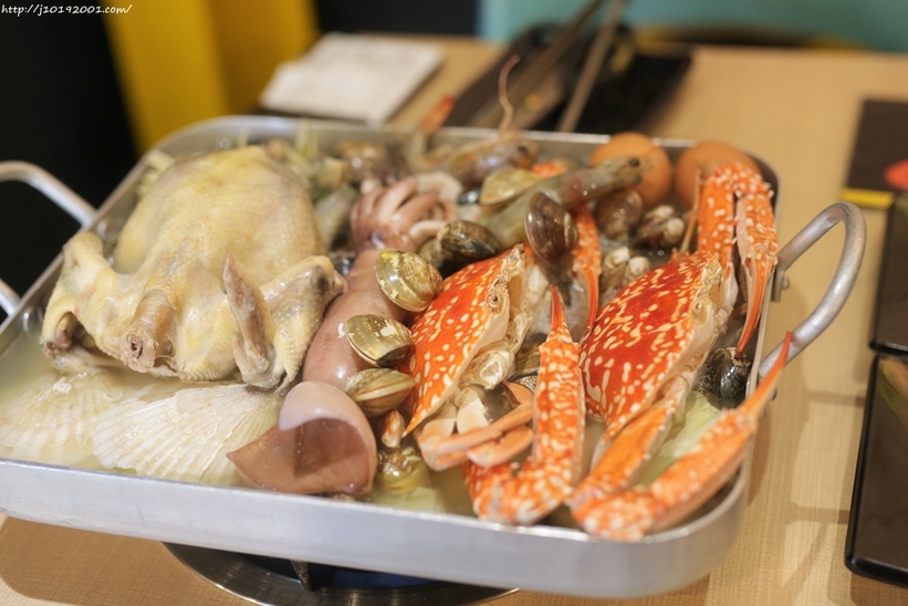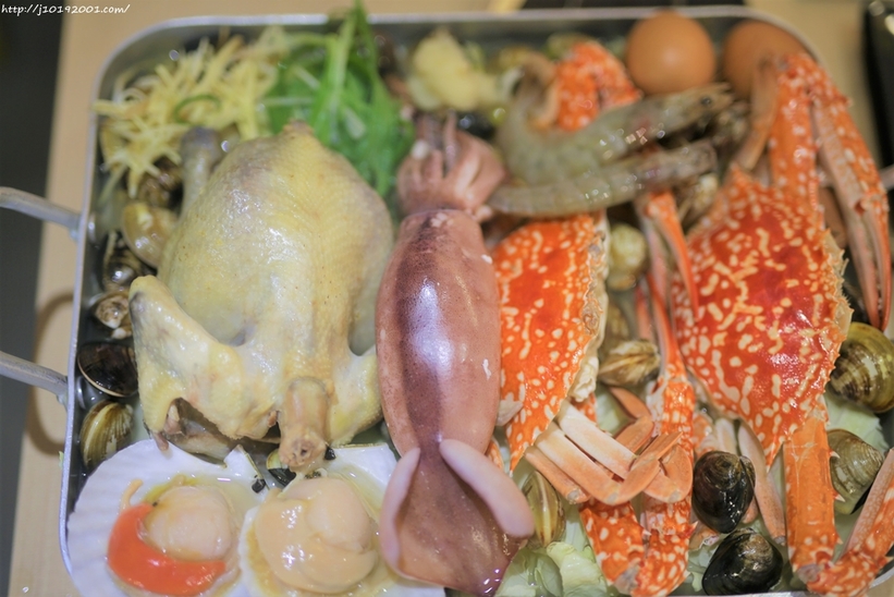 內容物有一整隻雞、章魚、帶子、蝦子、蛤蜊、扇貝、魷魚、螃蟹、雞蛋