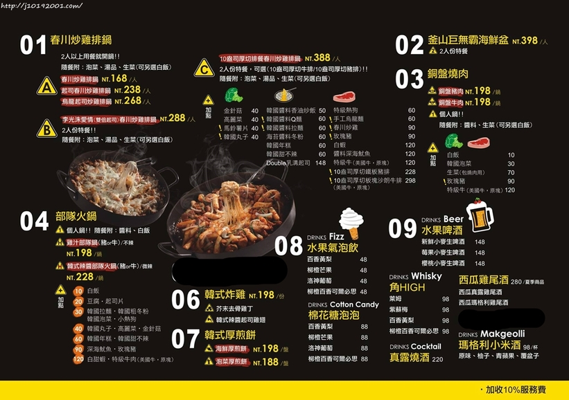 菜單打開除了春川炒雞與海鮮盆還有很多美食,部隊火鍋人氣也是居高不下,單點的菜色看起來也不錯,飲料可以配氣泡飲或酒。