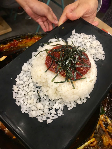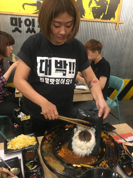 中間部隊鍋留下的湯頭,店員會在拿炒料來桌邊幫忙現炒一盤韓國炒飯