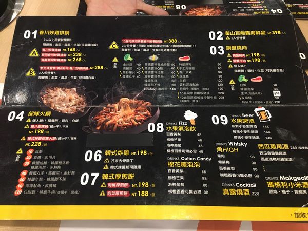 餐點在分為幾種組合:招牌春川炒雞鍋/部隊鍋/銅盤燒肉