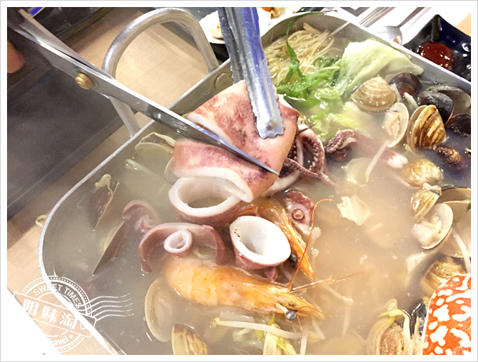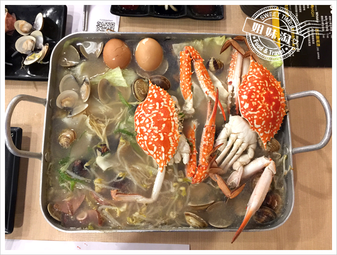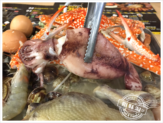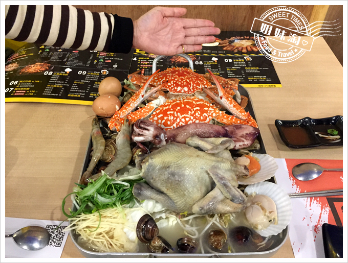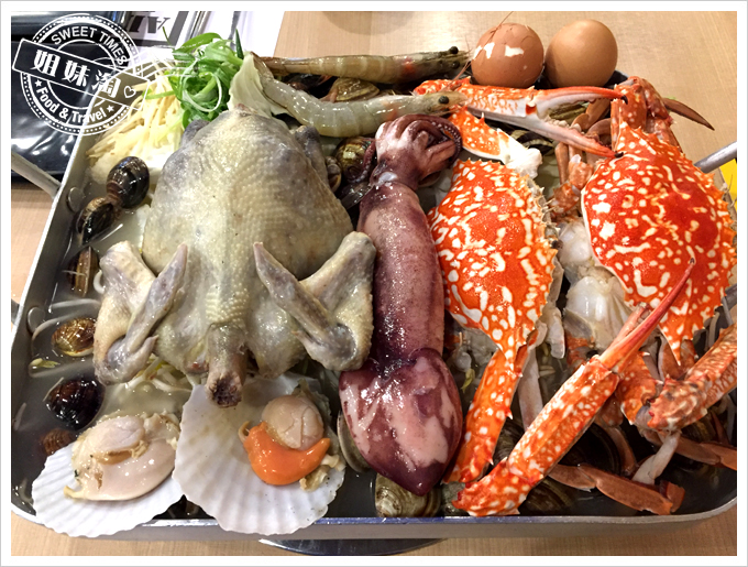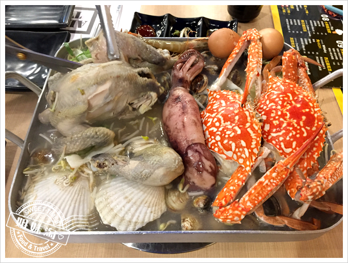 嘩,這...這也太澎湃了。這一鍋多吃裡是「一隻雞」加上「釜山-巨無霸海鮮盆」,雞是體型小,骨骼細,且肉質細嫩鮮美的春雞,釜山-無霸海鮮盆裡則有魷魚、扇貝、蝦子、蛤蜊、蔬菜等,超豐盛的。