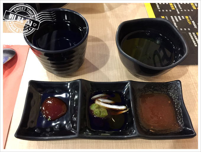 店家除了提供茶水外,也有海帶芽湯,另外沾醬更是不能少,由左至右分別是:韓國密製沾醬、芥茉洋蔥醬油以及道地的五味醬。