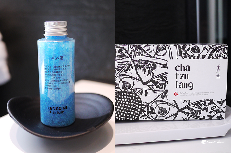 波卡拉會館還貼心的提供了沐浴鹽讓大家泡澡,並提供一組茶籽堂的清潔用品及乳液呢!