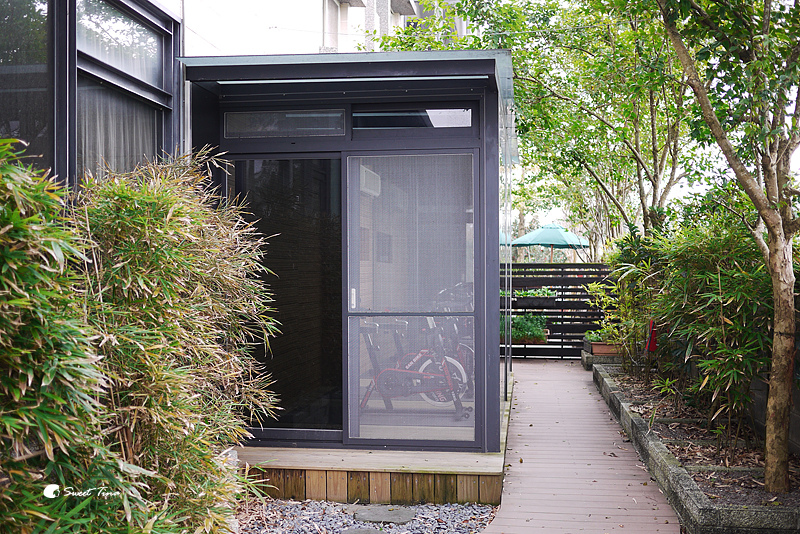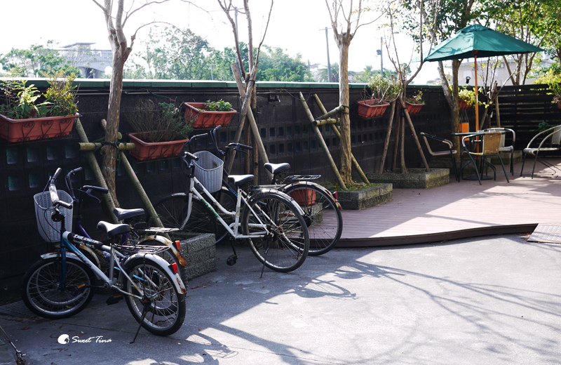 一旁還有停放腳踏車,可以提供房客免費租借,去感受這兒的田園風光,不過很可惜的是這兒沒有腳踏車專用道,雖然往返的車子不多,但我們還是不放心讓瑋兒在大馬路上騎腳踏車,所以就作罷囉!