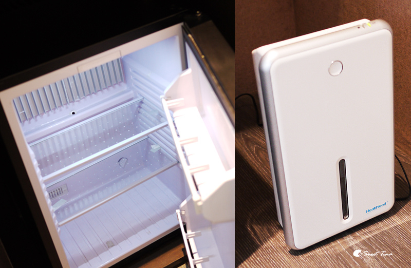 底下則放置了一台小冰箱及一台除溼空氣清淨機,進去房間時,環境的空氣味道處理的還滿不錯的。