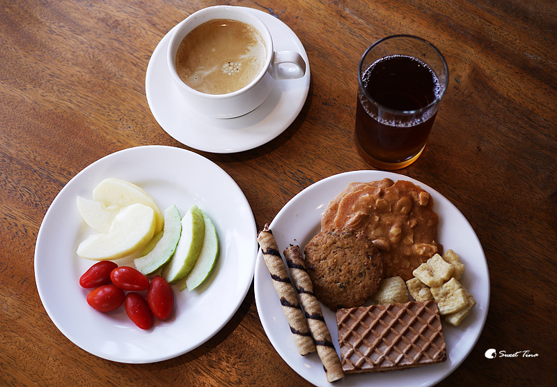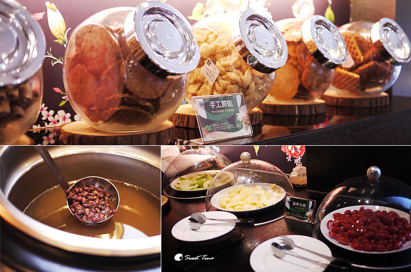 多樣化的手工餅乾、紅豆湯、當季水果。