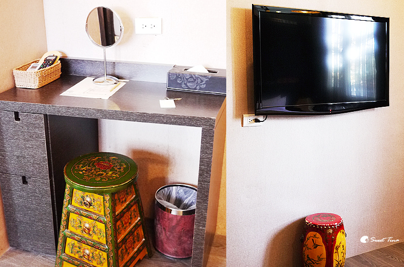 床的正對面牆上掛了一台42吋的液晶電視,休息時靠在床上看電視是還滿享受的,一旁則是這兒唯一可以放置東西的桌子,老實說我覺得有點太小巧了,如果是情侶或二個夫妻可能還夠用,但如果帶個小傢伙,東西隨便一放就爆了,所以我們有些東西都放在椅子上呢,這點對於大包小包的阿母來說是真的有些微的不便啊~