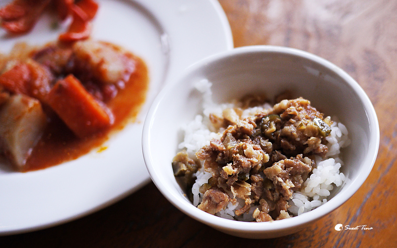 這兒的餐點我覺得還算滿多樣化的,是可以滿足到我們三個不同口味的人,我的話就夾些青菜及配料,搭上一碗肉燥飯,他們的肉燥很香,很值得品嚐哦!