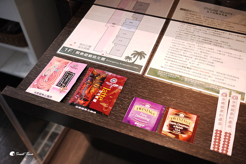 抽屜打開後,有逃生圖示及會館注意事項,這點還滿仔細的呢,而提供的飲品是TWININGS茶包、西雅圖的咖啡及奶茶。