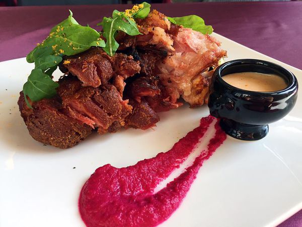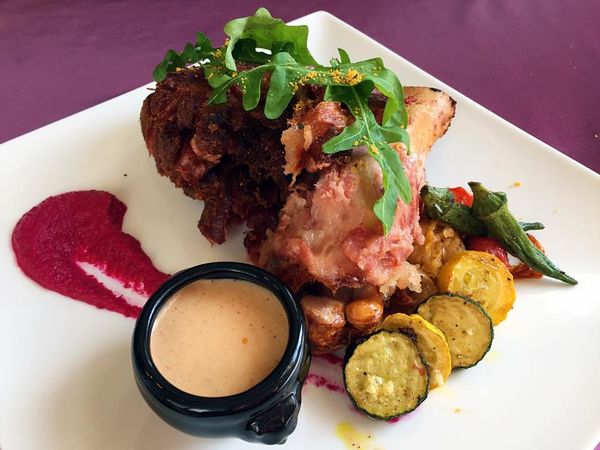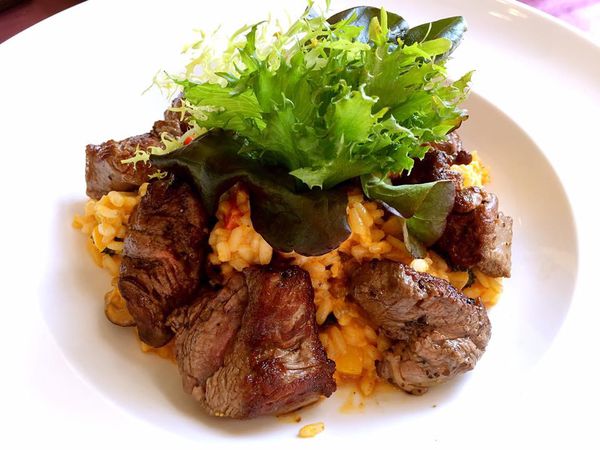 主餐:德式脆皮豬腳佐四季蔥白酒醬、(微辣)泰式香茅紅咖哩牛菲力燉飯