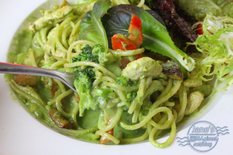 麵條是比較粗的那種,加上不會鹹的貝夏媚醬,