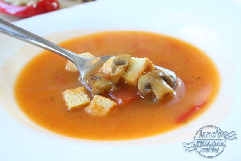 烤麵包丁,湯頭不會太酸或太鹹,比一般義式湯頭再濃一點。
