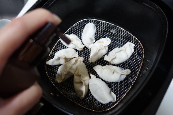 之後再噴些沙拉油在餃子上面, 讓餃子表面裹上一層油脂(少少的就好)。