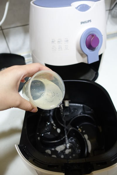 首先在氣炸鍋的籃子裡放一杯水