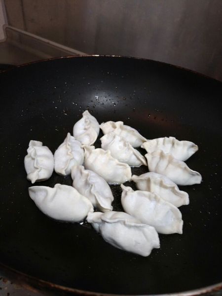 煎:平底鍋內油熱後,將餃子(不須解凍)排放入鍋內,同時加少許水,以小火慢慢乾煎至水乾,餃子皮至金黃色即可。