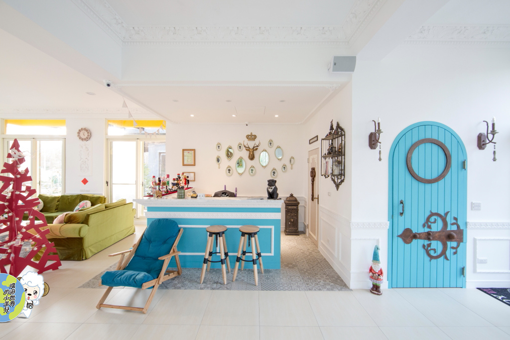 民宿的服務櫃檯,藍白的海洋風,擺設許多民宿老闆收集的各國小物。